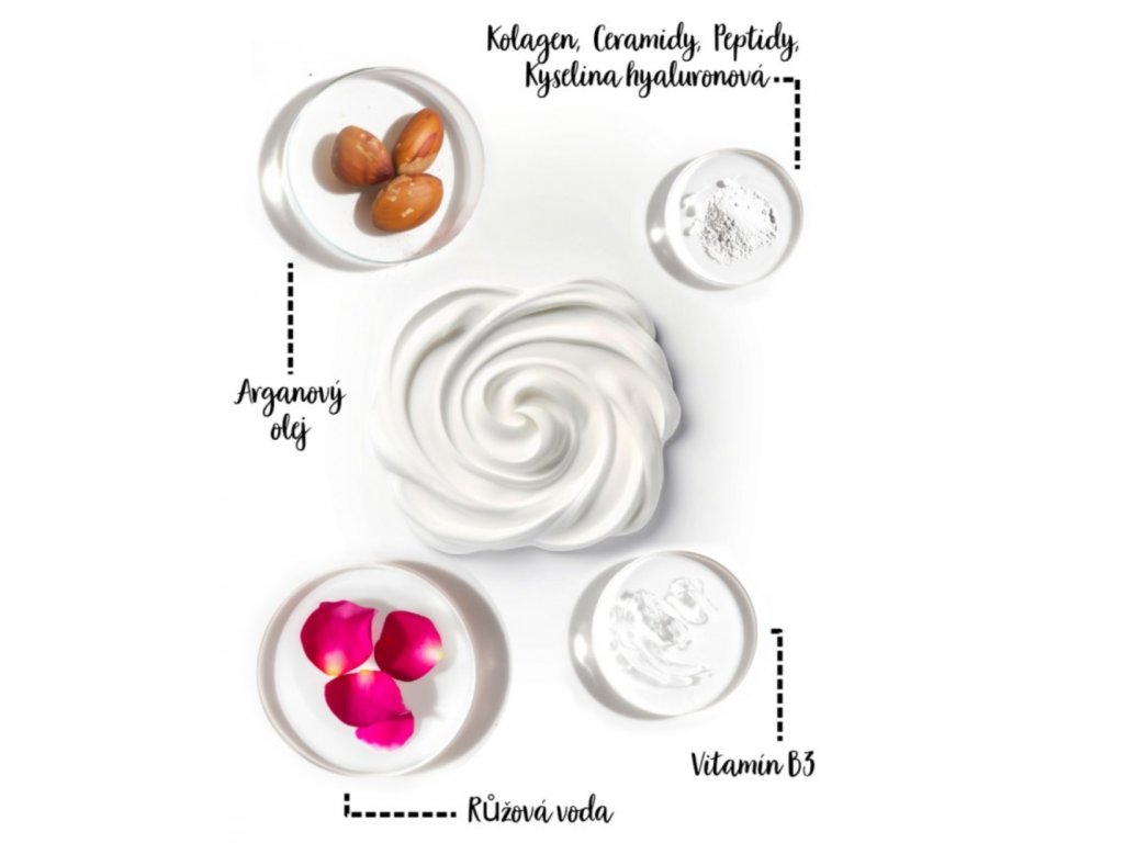 Obsahuje ružovú vodu, arganový olej, ceramidy, kyselinu hyalurónovú, kolagén, vitamín B3 a glycerín. Vďaka týmto zložkám krém hydratuje, vyživuje, pomáha obnoviť ochrannú kožnú bariéru a pôsobí proti starnutiu pleti. Použitie: Naneste na čistú pleť a krúživými pohybmi vmasírujte do pokožky. Nepoužívajte v okolí očí! Uchovávajte v suchu pri izbovej teplote do 25 °C.